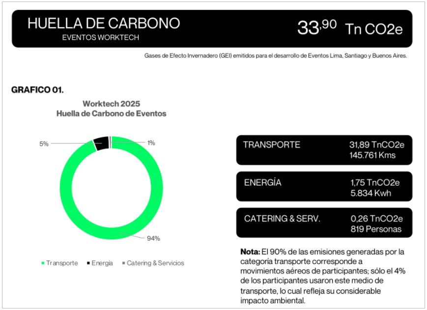 Los cálculos revelaron una huella de carbono total estimada de 33,90 TnCO2e (toneladas de dióxido de carbono equivalente) para el conjunto de los eventos. La mayor contribución provino de los traslados de los participantes, mientras que la energía utilizada y los servicios de catering representaron una fracción menor de las emisiones totales, aunque fueron igualmente contabilizados dentro del cálculo global. Esto subraya el impacto significativo del transporte aéreo en las emisiones de GEI y la importancia de cuantificar estos factores para comprender su contribución al cambio climático.