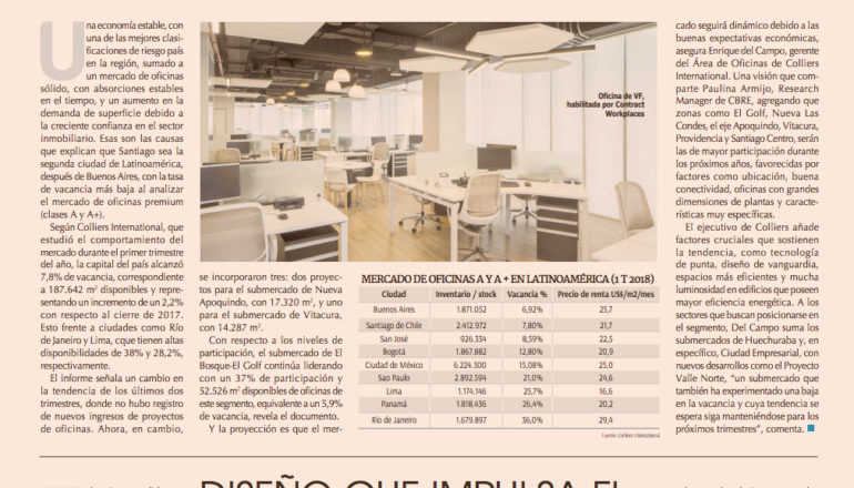 En esa línea, desde Colliers aseguran que tanto grandes como pequeñas empresas estudian su presencia en edificios que les permitan obtener mayor ahorro de energía y emisión de desechos, pero también mayor eficiencia a través de espacios colaborativos en formato de planta libre que “mejoran la habitabilidad, distribución e iluminación de los ambientes”, dice el gerente de oficinas de la compañía, Enrique del Campo, con la mirada puesta en sectores como El Bosque-El Golf, Nueva Las Condes y Nueva Apoquindo, donde están las mejores oportunidades y la mayoría de las certificaciones Gold.
